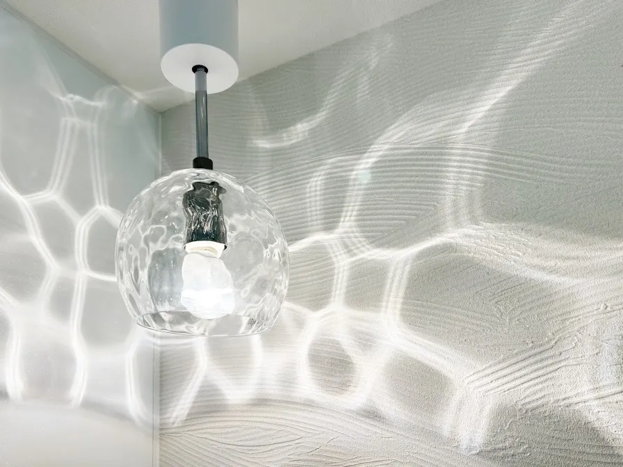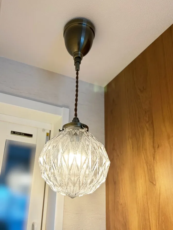 お施主様のペンダントライトがクロスの陰影と相まって、幻想的な雰囲気のトイレになりました