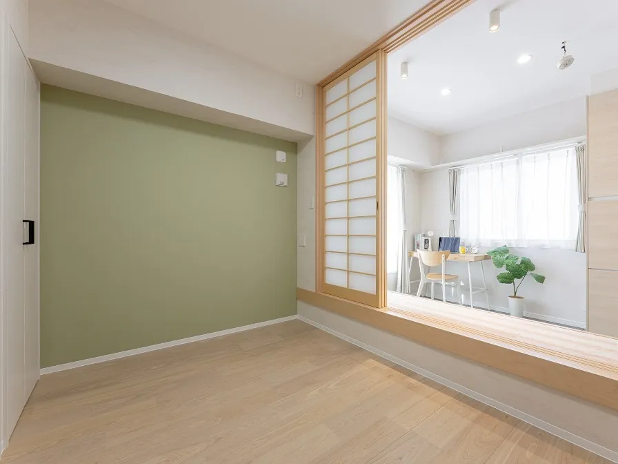 障子からつながる洋室3はアクセントクロスにグリーンを選ばれました