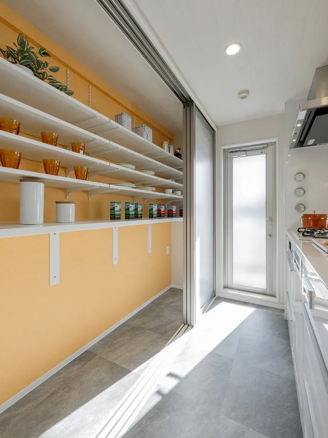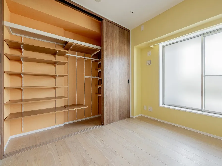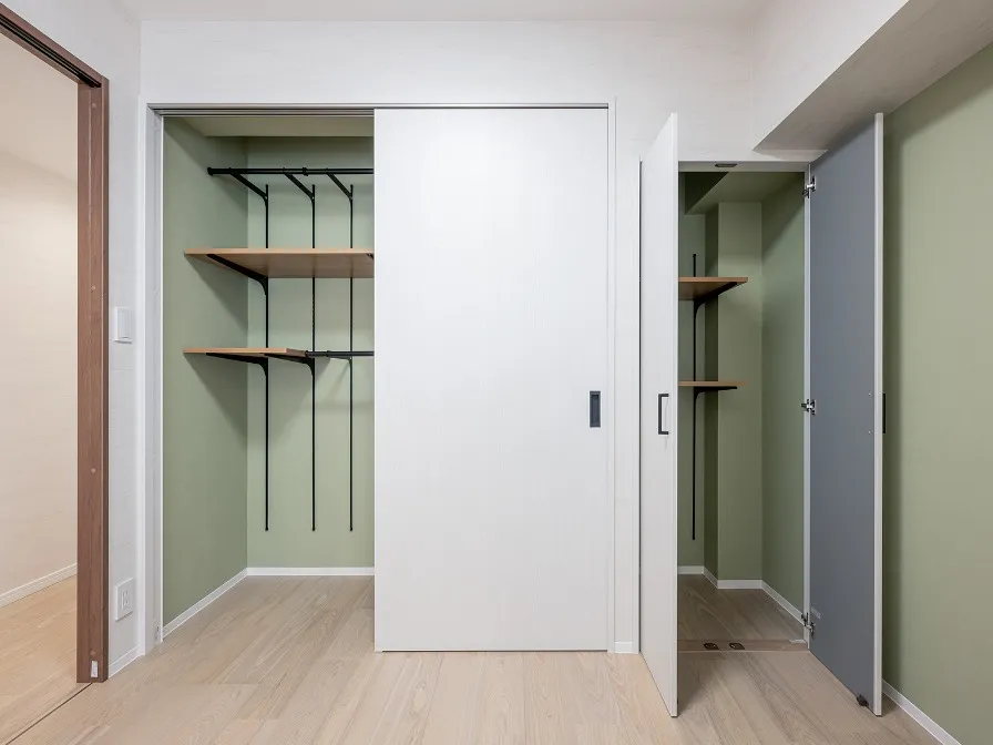収納用3枚連動引戸を開放するとこちらも大容量の収納です。アースカラーのアクセントクロスが明るくお部屋を彩ります