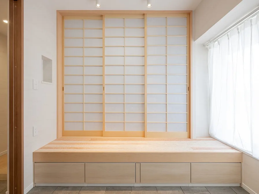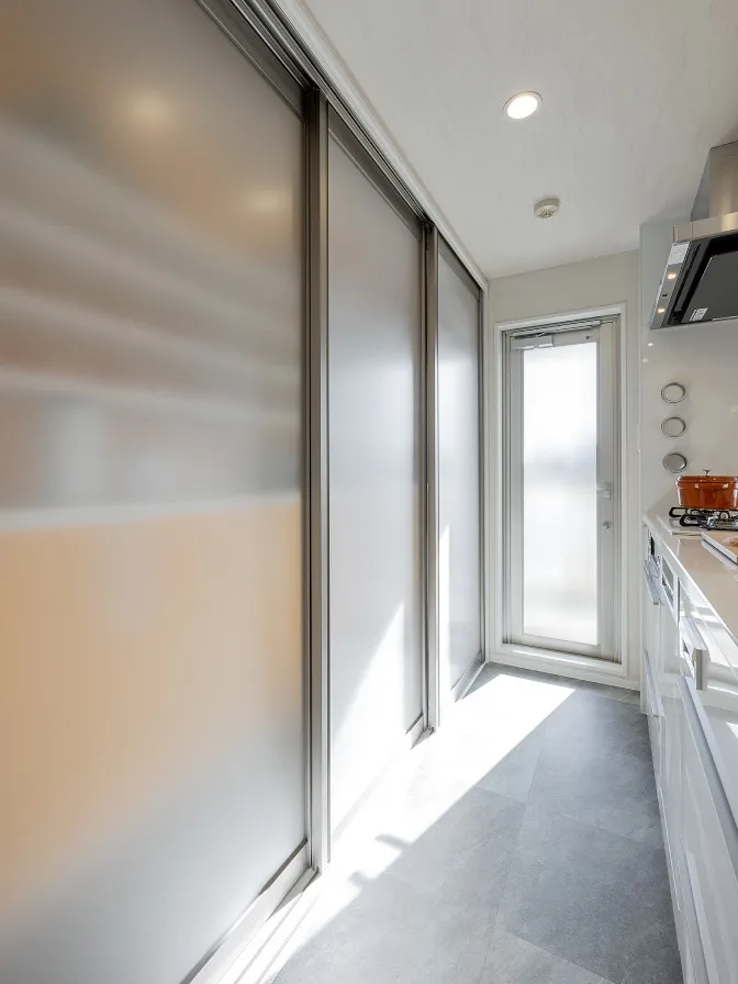 来客時に扉を閉めて視線を遮る事ができます。引き違い扉は、リクシルのラシッサSを採用しました