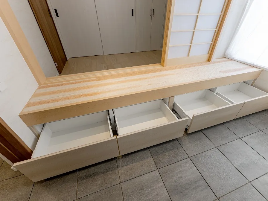 下部は引き出し収納になっています。上げ床の仕上げ部分は、なぐり板材を張りました