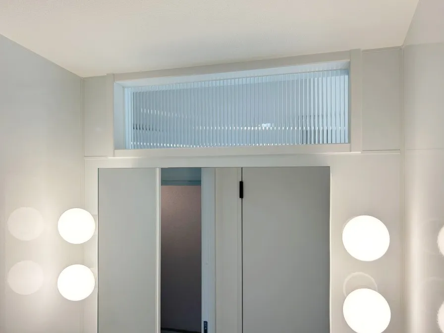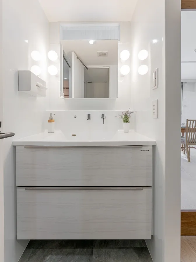 ミラーは小さめのBOXタイプを取付、まわりにお顔を綺麗に照らすライトを設置しました