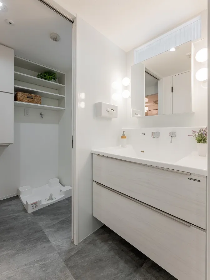 洗面台と洗濯機の位置を入れ替えて、廊下からすぐ洗面台に入れるようにしました。洗面台はタカラスタンダード「エリーナ」です