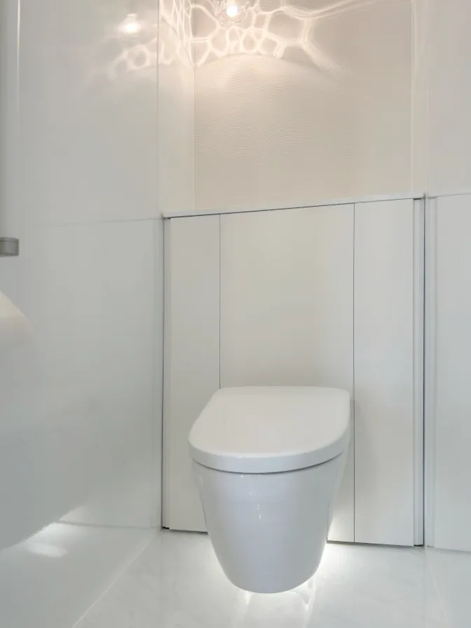 トイレ正面の壁面は波のようなマチエル感の櫛引調クロスです