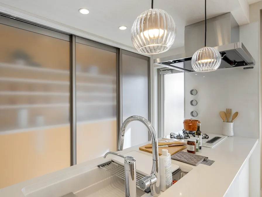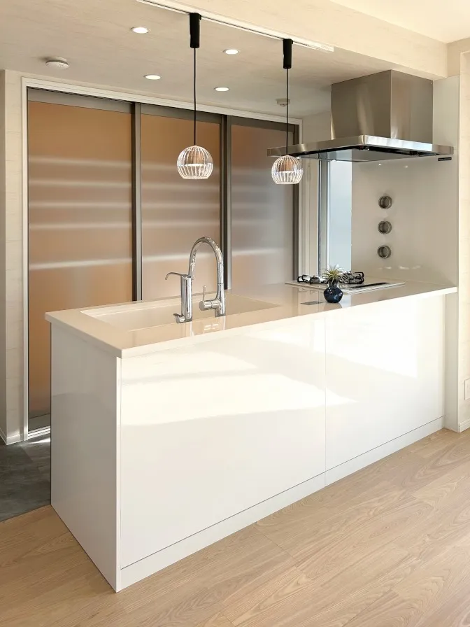 面材のとても美しいキッチン。上部にはライティングレールとペンダントライトを取り付けました