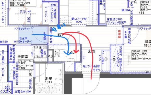玄関側からトイレに行く場合、自分の体が邪魔でドアが開けられないので、一度トイレを大きく行き過ぎて、体をリビング側に置いてから入るようになります。