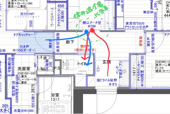 現場で何度もトイレドアを開け閉めしてみて、窮屈さを拭えなかったので、もう一度設計を検討してみました。