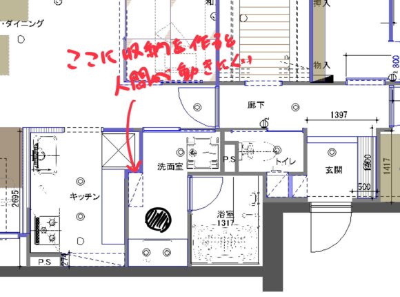 今の形を生かしたまま収納を作る案を作ってみたのですがしっくり来ず、着工までの課題として残っていました。