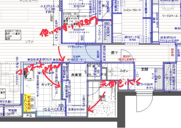 そこで、洗面台の寸法を1200mmから1000mmに変え、キッチン側の冷蔵庫の場所を手前から奥に変更することで