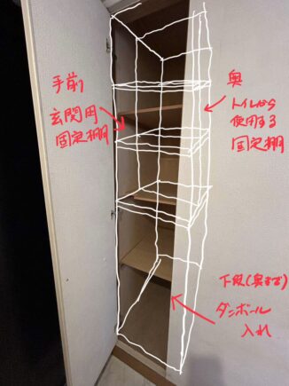 そこで、奥行の深さを利用して、下部を段ボール兼発泡スチロール箱入れ、上段は手前を玄関から使う収納、上段の奥はトイレで使う収納と、